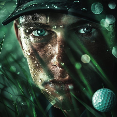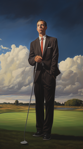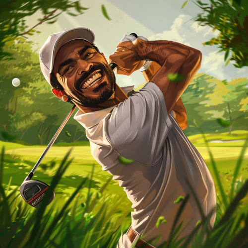 Adult Golf Player playing in front of camera , Cartoon Portrait, Funny Golf Portrait, Caricature, Golf Caricature, background Golf Court --style raw