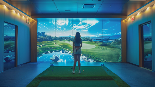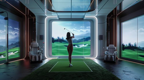 A large, modern, state-of-the-art golf simulator dominates the center of the photo, with indoor lighting shining brightly like sunlight, and the screen displays detailed images of the virtual golf course holes. In the center of the photo, a female model golfer is in front of the screen, preparing for a swing with a golf club in front of a golf ball, and there is grass in the center of the floor. realistic, CGI, VFX, SFX, DOF, F/22, FKAA, TXAA, RTX, SSAO, HDR, 8k, Hyper-realistic 4k --ar 16:9