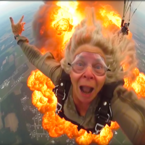 GoPro shot of ghetto granny skydiving through an explosion --weird 400 --v 6.0 --s 50 --style raw