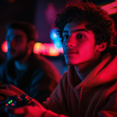 imaging someone looking competatively at their friend while they are playing xbox, playful intensity, cinematic, cinematic, ambient red light in the background