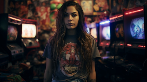 22 year old, woman, chola, chicano, hope sandoval, long hair, pleased expression, smiling, relaxed, confident, xbox, in the style of Jonathan Mannion, in her videogame room. Cinematic, Hyper-detailed, insane details, Beautifully color graded, Unreal Engine, DOF, Super-Resolution, Megapixel, Cinematic Lightning, Anti-Aliasing, FKAA, TXAA, RTX, SSAO, Post Processing, Post Production, Tone Mapping, CGI, VFX, SFX, Insanely detailed and intricate, Hyper maximalist, Hyper-realistic, Volumetric, Photorealistic, ultra-photoreal, ultra-detailed, intricate details, 8K, Super detailed, Full color, Volumetric lightning, HDR, Realistic, Unreal Engine, 16K, Sharp focus --ar 16:9
