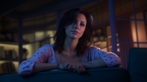 A gorgeous older woman, curvaceous, 55 years old, anglo, in a videogame room, leaning back on her couch, wearing casual clothes, pleased expression, smiling, relaxed, confident, in the style of Jonathan Mannion, in videogame room. Cinematic, Hyper-detailed, insane details, Beautifully color graded, Unreal Engine, DOF, Super-Resolution, Megapixel, Cinematic Lightning, Anti-Aliasing, FKAA, TXAA, RTX, SSAO, Post Processing, Post Production, Tone Mapping, CGI, VFX, SFX, Insanely detailed and intricate, Hyper maximalist, Hyper-realistic, Volumetric, Photorealistic, ultra-photoreal, ultra-detailed, intricate details, 8K, Super detailed, Full color, Volumetric lightning, HDR, Realistic, Unreal Engine, 16K, Sharp focus --ar 16:9