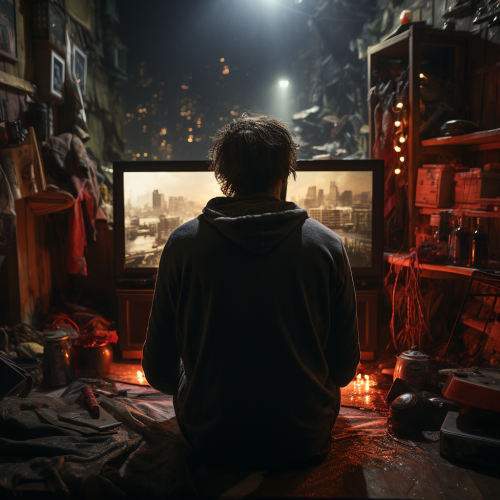 25 year old man sitting indoors, really far away from a really small tv that he is playing xbox on --s 750