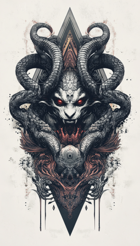Create a detailed and intense tattoo design of the Trinacria symbol with an aspect ratio of 4:8. Feature the central Gorgon's head with serpentine hair, sharp fangs, and piercing eyes. Surround the Gorgon with three dynamic, muscular legs positioned in a triangular formation, each with intricate details and shading. Add ornate patterns or baroque flourishes around the central figure to frame it. Use bold contrasts with deep blacks, rich grays, and touches of red or gold for emphasis. The design should be highly detailed with fine line work and a dramatic effect, suitable for a vertical tattoo placement. --ar 4:7