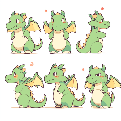 2D animated version of a light brown with green dragon, full body, multiple angles, multiple expressions, cutout, in the style of paper mario, subtle coloring, white background, doodle style, minimalistic design, flat color illustration, simple setting, bold black and white thick line style --niji 5