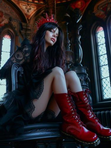 illustration of three goth girls in Thigh High Boots fishnets and dressed in a skin tight latex , urban goth, black & red colors, with black background, black & blue colors, comic book style, charactor by Sarah Andersen, rich in details, --ar 3:6 --s 777 --v 6.0