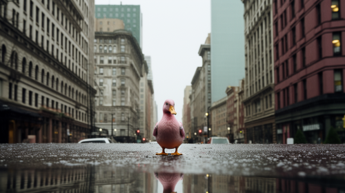 movie shot of Gotham city, rain, huge pink duck in the sky, classical symmetry, glazed surfaces, fujifilm ga645 --v 5.2 --ar 16:9