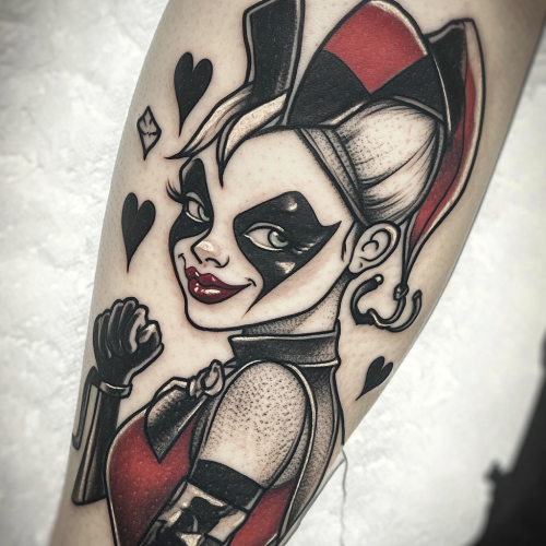 Black and grey tattoo design of Harley Quinn in a dynamic pose, showcasing her iconic jester outfit. Focus on a highly detailed, realistic portrayal, with her signature mischievous expression, pigtails, and exaggerated makeup. Incorporate her classic weapons like the oversized mallet or a baseball bat, along with subtle playing card motifs (diamonds, hearts) in the background. The shading should emphasize strong contrasts, capturing the character's chaotic and rebellious nature in a dark, yet stylish, aesthetic.