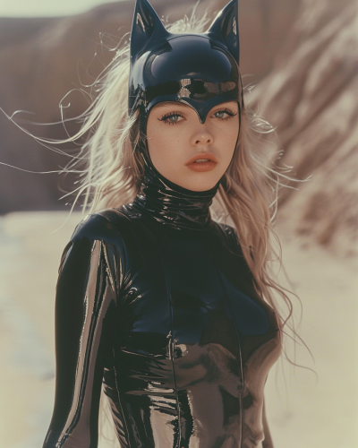 A medium length shot of Billie Eilish as Harley Quinn, the new Catwoman, in grey latex catsuit, retro superheroine from a 1968 superhero TV show, 35mm kodachrome --ar 4:5 --style raw --stylize 750 --v 6.0