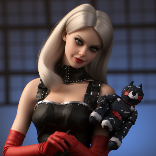 full body view of DC Comics Harley Quinn in Comic book accurate costume, comic book accurate make up, portrayed by actress Margot Robbie, posing with a Batman stuffed plushie doll, as comic book cover art by artist Alex Ross, depth of field, vibrant colors, realistic, 32k resolution, highly detailed, high definition, natural lighting, natural shading, illustrating ink, airbrushed, 11:14, v 6.0
