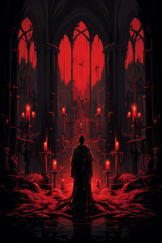 gothic cathedral interior, lots of candles, red dramatic light, vector illustration, t shirt design, --ar 2:3