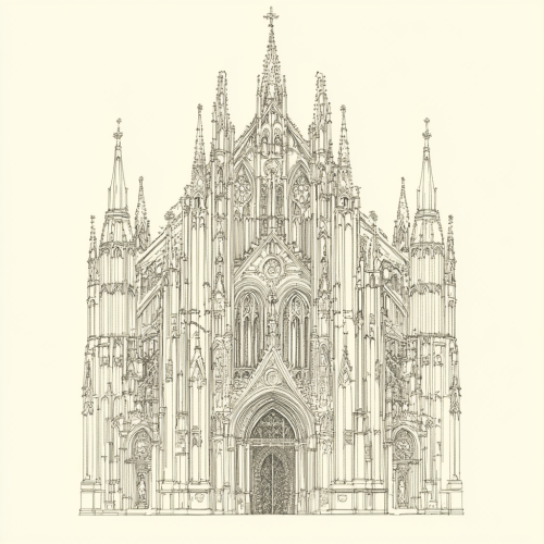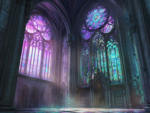 Design the interior of a Gothic cathedral, where the towering arches and stained glass windows are infused with iridescent colors. The scene should feature intricate, ornate details reminiscent of Gothic architecture, with a modern twist. The light streaming through the windows creates a kaleidoscope of colors on the stone walls, blending deep purples, blues, and greens with a touch of gold. --ar 4:3