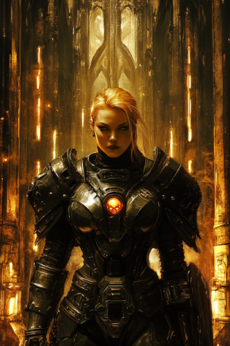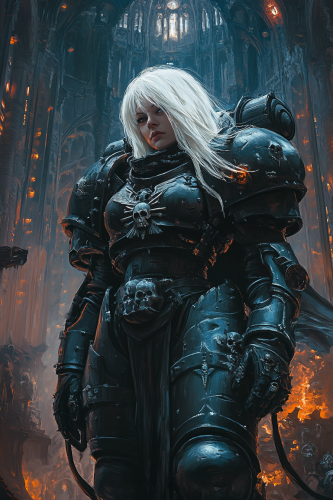 a full body shot of a female grimdark sister of battle. She wears dark grimdark power armor. Her face is visible. In the background is an underground dark grimdark gothic cathedral in a hive city with llights. digital painting --ar 2:3 --v 6.1