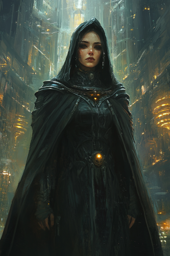 a full body shot of a female grimdark sister of battle. She wears a dark grimdark gothic robe. Her face is visible. In the background is an underground dark grimdark gothic cathedral in a hive city with llights. digital painting --ar 2:3 --v 6.1 --no marine