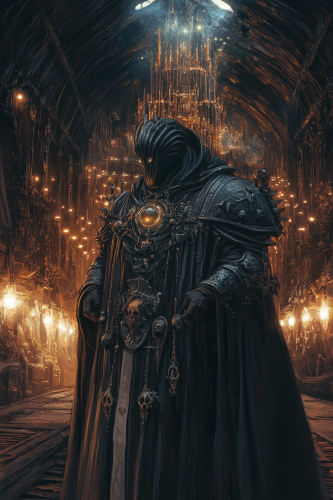a full body shot of a male grimdark initiate. He wears a simple grimdark gothic robe. His face is visible. In the background is an underground dark grimdark gothic cathedral in a hive city with llights. digital painting --ar 2:3 --v 6.1 --no marine