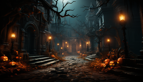 Haunted gardens of a dark, gothic castle at night, with twisted, eerie plants and overgrown pathways. The moon casts an ominous glow over the scene, with shadows stretching across the ground. Dead trees with gnarled branches reach up like claws, and thorny vines wrap around broken statues and fountains. Creepy, glowing jack-o'-lanterns are scattered throughout the garden, adding a sinister Halloween vibe. Fog rolls across the ground, and strange, ghostly lights flicker among the trees. The entire scene feels spooky, mysterious, and filled with dark magic, perfect for a haunted fairy tale. - HD and realistic style in a magical setting --ar 7:4 --s 750 --v 5.2