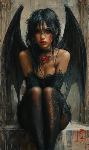 painted in the style vorticist Fresco mixed with realism and pop art with pops of color, a gorgeous fallen angel wearing stocking, in the style of black and white intimacy, feminine body, in a gargoyle like pose on the edge of a gothic cathedral, gentle lyricism, lush and detailed, tenebrism-inspired --chaos 20 --ar 3:5 --stylize 1000