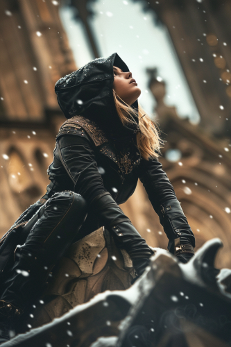 A beautiful blonde female assassin wearing black leather armor and hood in the style of Assassin’s Creed sitting high above the town on the head of a gargoyle on the roof of a Gothic cathedral, looking up at in the sky, giant snowflakes falling from the sky, photorealistic, Canon EOS 5D Mark IV style, 50mm lens effect, golden hour, high saturation, high contrast, HDR processing, vignette effect --ar 2:3 --style raw --v 6.0