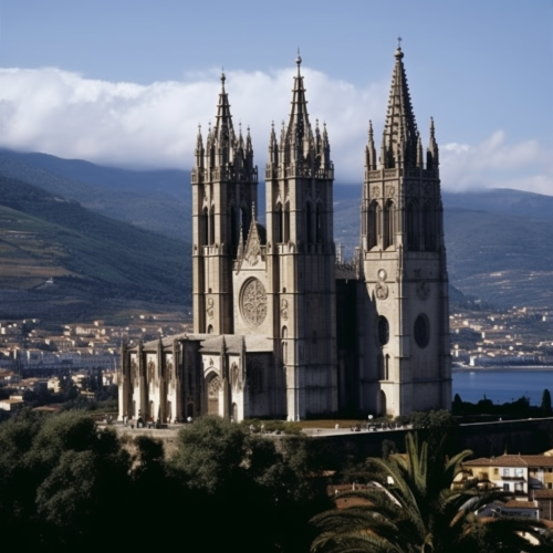 The grand interior of a gothic cathedral, with towering stained glass windows, rows of wooden pews, and light streaming through, casting colorful patterns on the stone floor, 1:1 --v 6.1
