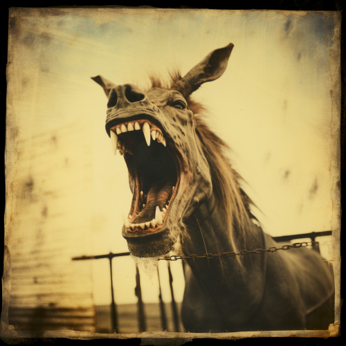 a child with a demonic expression, he has an unusually big smile. His hair is disheveled, he is hunchbacked, his fingers are very long. He is dressed in overalls and is barefoot. Paint