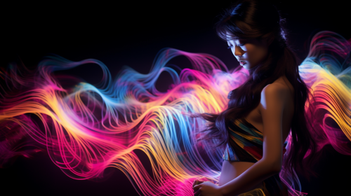 a beautiful Asian model made of multicolored neon quantum entanglement in the fractal mist macrophotography blackbackground --ar 16:9 --style raw --stylize 75 --v 5.2