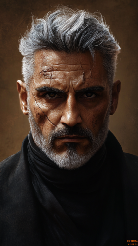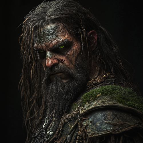 Create a highly detailed, full-body portrait of Gol'uk Dura-Thruk Gra-Tar'Uk, a 7-foot-tall half-orc warrior in a dramatic comic book style. The character stands proudly atop a misty mountain, exuding a rugged and charismatic presence. Character Details: Attire: He wears a weathered white linen shirt with a leather vest over it, both showing signs of wear and tear. His jeans are dirty and rugged, paired with sturdy cowboy boots. A large gold belt buckle with a golden wagon wheel emblem prominently features on his belt. Hat: A cattleman cut cowboy hat with attached horns from a beast he killed, adorned with a hat band featuring colorful feathers in the center. Weapon: He wields a massive great axe that doubles as a magical lute, with the handle intricately designed to act as the neck of the lute. The axe’s head should look both menacing and musical, blending the aesthetics of a weapon and an instrument. Physical Traits: Gol'uk's skin is a pale grey olive green, and he has a muscular build. His bottom teeth protrude like tusks in a crooked, charismatic grin. Pose and Expression: He stands in a powerful pose, reflecting strength and resilience, with a crooked grin that reveals his tusk-like teeth. His stance should convey both his warrior prowess and bardic charm. Background: The scene is set on a misty, rugged mountain with stormy skies above, emphasizing his connection to the elements and his epic journey. The atmospheric lighting should highlight the dramatic, high-fantasy mood of the setting. Stylistic Influences: The illustration should blend the styles of Brian Michael Bendis for dynamic composition, Chris Bachalo for expressive character design, James Bama for vibrant, cinematic color schemes, Frank Frazetta for epic fantasy elements, Artgerm for detailed and [...]