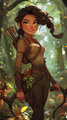 A fun and adventurous Forest Ranger with a playful smile, wild, wavy dark hair tied back in a messy braid, and bright, mischievous green eyes. She wears a cool, stylish outfit made of leather and leaves, in earthy tones with fun, whimsical details like patches of moss and vines. She carries a sleek bow that’s almost as tall as she is, always ready to strike, and has a quirky connection with animals, as small woodland creatures follow her playfully. In a vibrant Pixar style, with exaggerated features, colorful textures, and a lively, cartoonish forest full of movement and fun. --ar 9:16