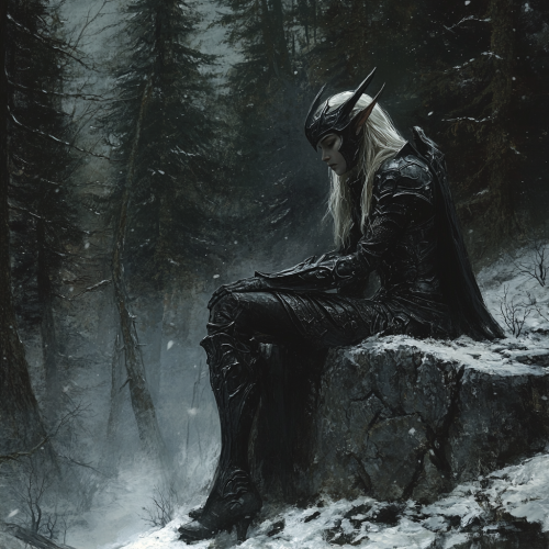 extremely detailed and realistic, grim dark gothic atmosphere, alan lee artstyle, female elf warrior hiding behind the stone in the bottom of the image, cold and terrible pine forest in the background, elegant and sophisticated black elf armor
