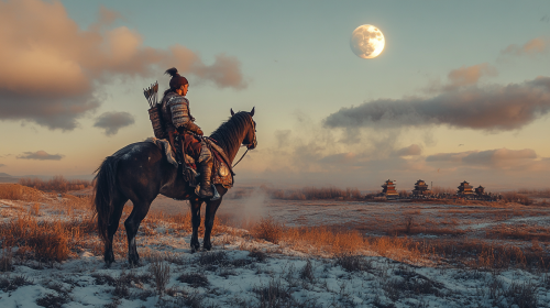 A Mongol woman soldier scouts the area near a European city, mounted on his pony, wearing leather armor and a leather helmet, his sword and bow standing next to his horse, early morning, moon seen a little, some snow on the ground, The steam of the breath she takes in and out comes out, cinematic image --ar 16:9