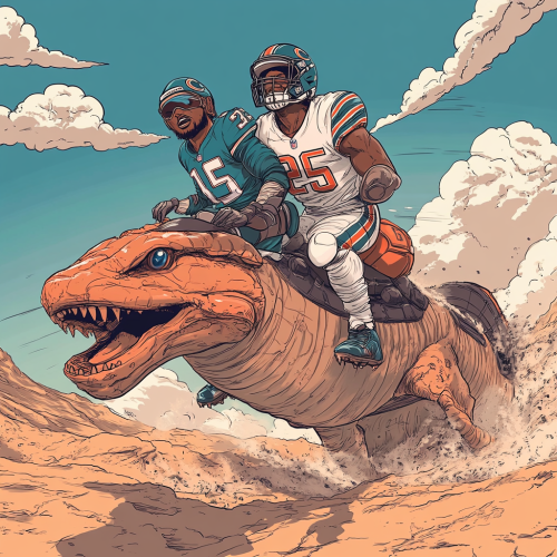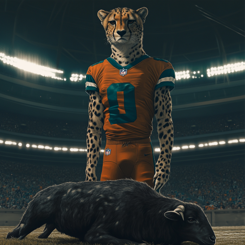 a cheetah in a Miami dolphins uniform standing confidently after and on top of a deceased black lamb after a hunt in a football stadium under the lights. Hyper-realism