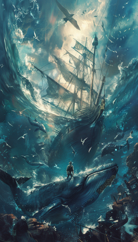 #104033 a man on a ship swims among whales in the atlantic ocean --v 6.0 --ar 4:7