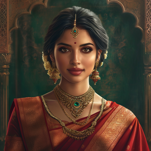 a breathtaking Indian woman with flawless, radiant brown skin, glowing in the soft, golden light. Her large, almond-shaped eyes are a deep, mesmerizing brown, lined with kohl to enhance their captivating allure. Her long, jet-black hair is intricately braided, adorned with delicate jasmine flowers. She wears a traditional deep red silk saree with intricate gold embroidery, the fabric shimmering with each movement. Her jewelry includes a stunning gold necklace with emerald accents, matching earrings, and a delicate nose ring. The background is a vibrant Indian palace courtyard, with ornate arches and lush greenery. The scene is captured in 8K high resolution, highlighting every exquisite detail, from the textures of the fabric to the intricate patterns in her jewelry, with a soft bokeh effect that draws attention to her stunning beauty. 8k , beautifully color corrected, cinematic, 35mm, f 1.8 --ar 4:7