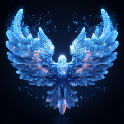 Vector illustration of glowing angel wings isolated on black background. Vector illustration in the style of an angelic figure. The wings glow against the solid black backdrop with an ethereal light. The artwork presents an inspiring vision of wings that seem to float independently, as if ready to lift the figure into flight. in 3d style --s 750