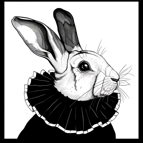 :A cartoon rabbit head in a Ruffled Collar, minimalism, black and white flat illustration, the Helsinki school