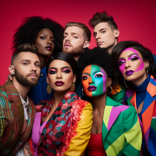 A diverse group of men and women showcasing different styles of makeup and fashion, each person emanating confidence and flair. The backdrop consists of vibrant colors and geometric patterns, captured in 4K using a mirrorless camera effect
