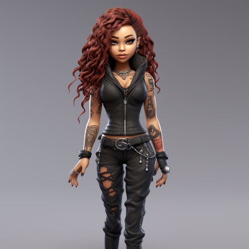 : Character Description: Create a goth black teen girl with tattoos, dark makeup, leather clothing, piercings, an average build, light brown skin, long red curly hair with bangs, and soft, dainty features. Avoid any stereotypical features for black women. Art Style: Render the character in a 5D cartoon animation style with a clear, clean finish.