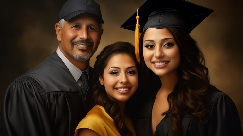 photo realistic hispanic mother and father with daughter at her graduation from college --ar 16:9