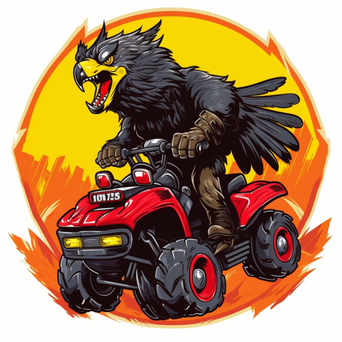 a fun cartoon picture for a sticker of KC Wolf mascot riding a four wheel All Terrain Vehicle through a flock of black birds. In a red black and yellow color scheme. --v 5.1