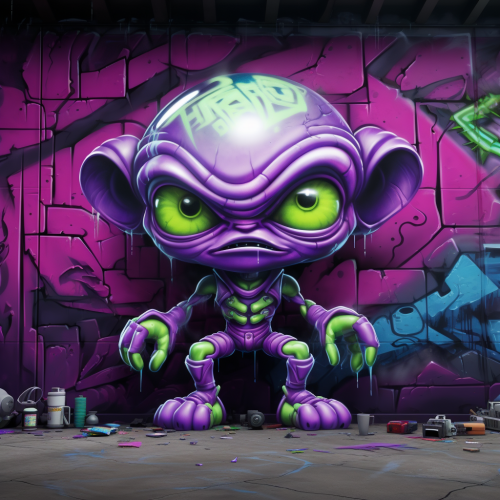 little cute cartoon graffiti and street art with a purple and acid green palette, neon art, sci fi, 4k, hyperrealistic, hyper detailed, aliens