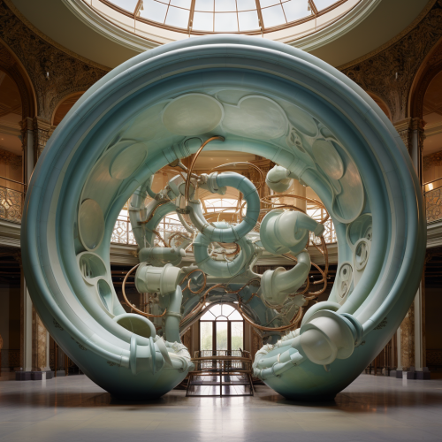 a grand, machine that tells the, ancient, many moving parts, day, month, year , made of porcelain, creams, blues and greens, mysterious , sits inside giant 20-foot wide metal ring, in the style of Victor Horta and Thomas Heatherwick