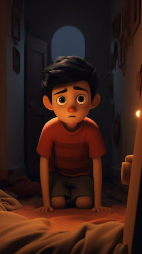 ANIMATION OF AN ASIATIC, 10 YEAR OLD CHILD who sneaks away, hides his OWN SECRET, stays in his room, doesn't let his parents see it --ar 9:16