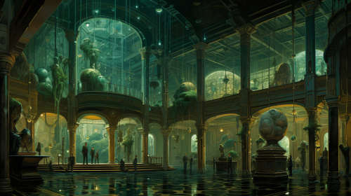 art nouveau oil painting of a crowded grand art-deco museum filled with towering aqua tanks containing strange cerulean life-forms, interior architecture style is a mix of ornate gothic detailing and arcology-inspired lush green walls and art-deco influences, rainy night lighting dark and cool colors, old-master oil painting with fine brushstroke detail + in the style of rembrandt --ar 16:9