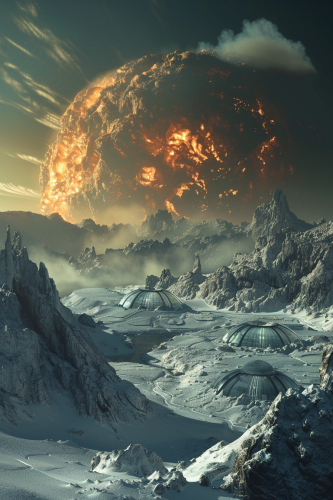 An awe-inspiring vista of a frigid ice world with white fog, cinematic photorealistic 8K. The Great Explosion of dome habitats. A huge fireball covers a cluster of sleek, futuristic dome habitats with elegant curved forms and crystalline surfaces. Aim for a cinematic composition that could be a still from an epic science fiction film, evoking a sense of grand scale. --ar 2:3 --v 6.0