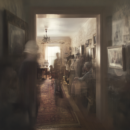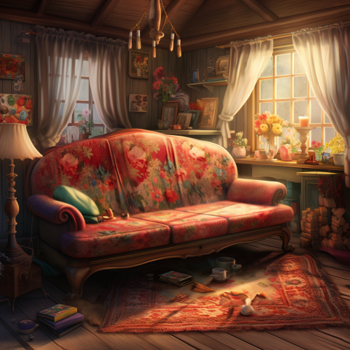 an image of the distorted view of someone's favourite room full of family momentos as seen by someone with dementia seen from behind. generate less photorealistic results and move toward a more artistic, surreal visual style