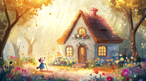 A storybook-style children's drawing of the Wolf standing at Grandma’s cottage door, knocking gently with an innocent expression on his face. The cottage has soft, rounded shapes, surrounded by colorful flowers and tall trees. Grandma is approaching the door curiously from inside, unaware of the Wolf’s sly intentions. The scene is warm and homey, with soft shadows and glowing light, creating a playful and curious mood --ar 16:9 --v 6.1
