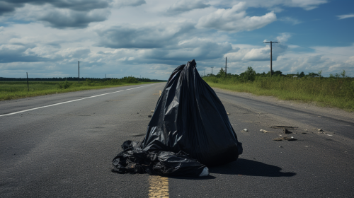 One black garbage bag on the side of the road, wide-angle photo --ar 16:9