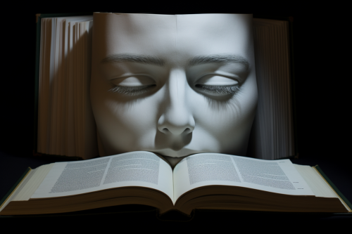 Image froma book and on the background a room, from the point of view of the readers eyes, including parts of the face like nose, headless way, hyper realistic, --ar 3:2