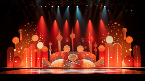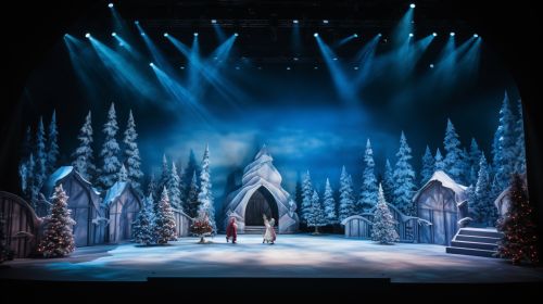 photo of the stage design of a 1950s Christmas concert. The stage design should an abstract winter wonderland with exciting lighting, Christmas lights, a crazy color palette, and a high budget. 16k, --ar 16:9