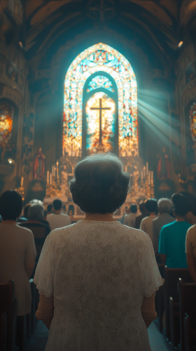 Filming the grandmother looking at the cross from the side, various people are praying while looking at the cross inside the church, full shot with the grandmother at the center, the grandmother is wearing a white blouse, the sacred feeling, the warm lighting, the warm sunlight coming down from the stained glass --ar 9:16 --iw 3.0