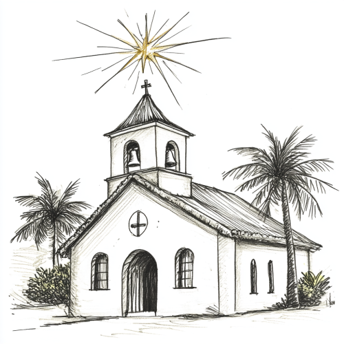 A simple black and white, hand-drawn illustration of a traditional Filipino church with a star above and a bell, representing Simbang Gabi (Misa de Gallo). The scene shows a peaceful, early morning atmosphere with the church illuminated for a Christmas mass. Minimalist, sketch-style art with clear lines, capturing the essence of Filipino devotion and anticipation of Christ's birth.
